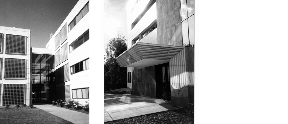 The buildings are skillfully set into the topography, and are connected with a light filled lobby adorned with articulated stonework.