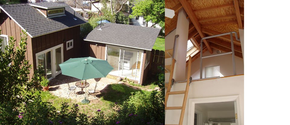 The design separates the enclosed area into two small structures; a living/ sleeping pavilion, and a separate kitchen. With the steeply sloped hillside they enclose an outdoor living room.