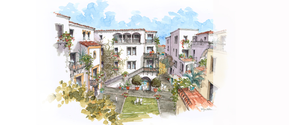 Restricted to Spanish revival style , the project is filling in the small scale fabric of this traditional town. The massing was broken into virtual buildings, which would be finished in different materials, and different methods, to achieve the appearance of a neighborhood grown over time.