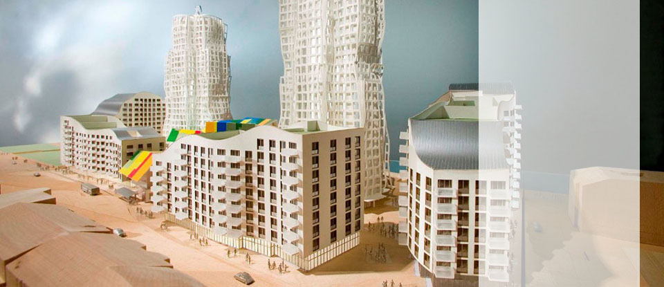 The two towers lying in the centre of a development and are flanked on all sides by a series of angular multicolored blocks totaling ten buildings and will - together with the towers -contain 700 apartments.