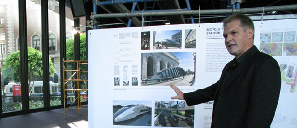 Gerhard W. Mayer addressing a crowd at an exhibition opening in downtown Los Angeles